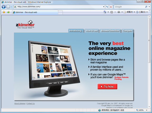 進入網站後,不需要登入,就能直接觀看雜誌了,可從上方的「Browse Selection」來選擇雜誌(當然還是英文的..)閱讀,「How to use」則是介紹操作方式,相信只要是用過Google Maps的人都會用。「Compare」則是比較zkimmer與其他電子書閱讀器的不同。