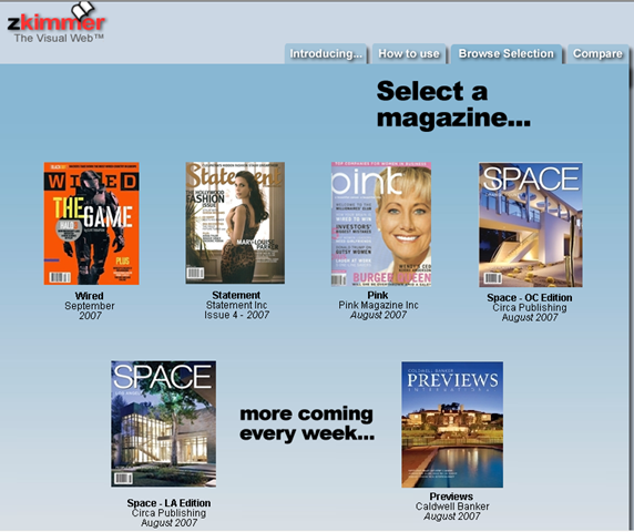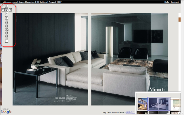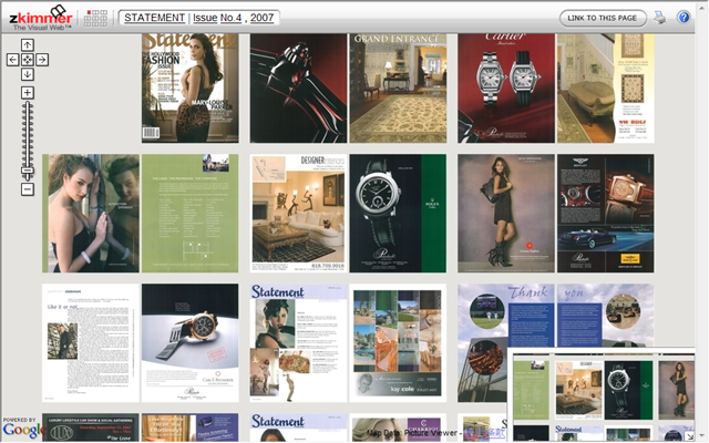 新成立的「zkimmer」(the visual web)網站,還在雛型及測試階段,它使用了Google地圖的技術來載入雜誌內容,相當具有創意,而且一次能呈現整個雜誌的面貌,看到你興趣的部份再放大觀看即可,不同於以往的電子書閱讀,只能靠目錄搜尋或一頁一頁瀏覽內容。
