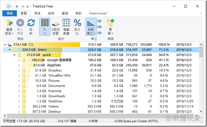 說到磁碟報告軟體,在阿正老師的印象中應該屬TreeSize這套是牌子又老(超過15年,而且版本持續更新)、又好用的一套了。操作非常簡單,而且有中文界面,只要選擇好磁碟機或資料夾即可進行統計,按下資料夾前面的v號可以展開資料夾,以獲得更詳細的檔案資訊。