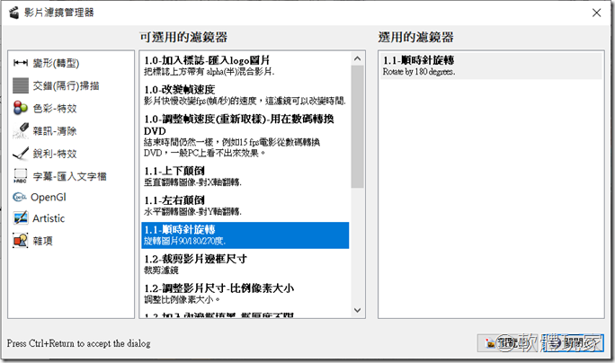 影片方面:VCD, DVD, MPEG-4, FLV...等主流格式 (不支援rm/rmvb) 音效部份則有WAV, MP2, MP3, AAC, AC3...等 視訊濾鏡也有數十種之多(如下圖),如變形、改變顏色、支援多種字幕格式、浮水印、選單、馬賽克...等