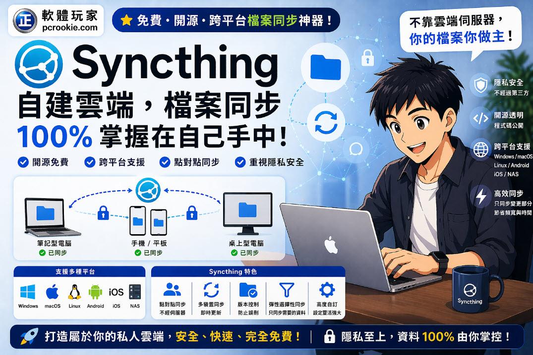 Syncthing採用「去中心化」的 P2P 技術,讓你的電腦、筆電、手機之間直接連線同步。