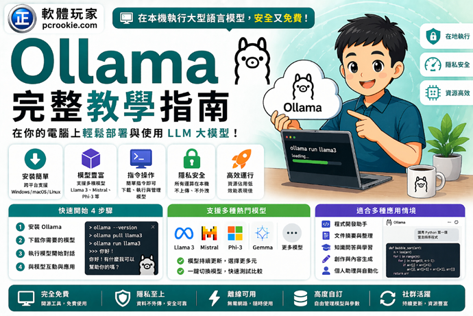 但 Ollama 就像是「AI 界的 App Store」,你只需要下載、安裝、輸入一行簡單的指令,強大的 AI 就會乖乖坐在你的硬碟裡隨時為你效勞!