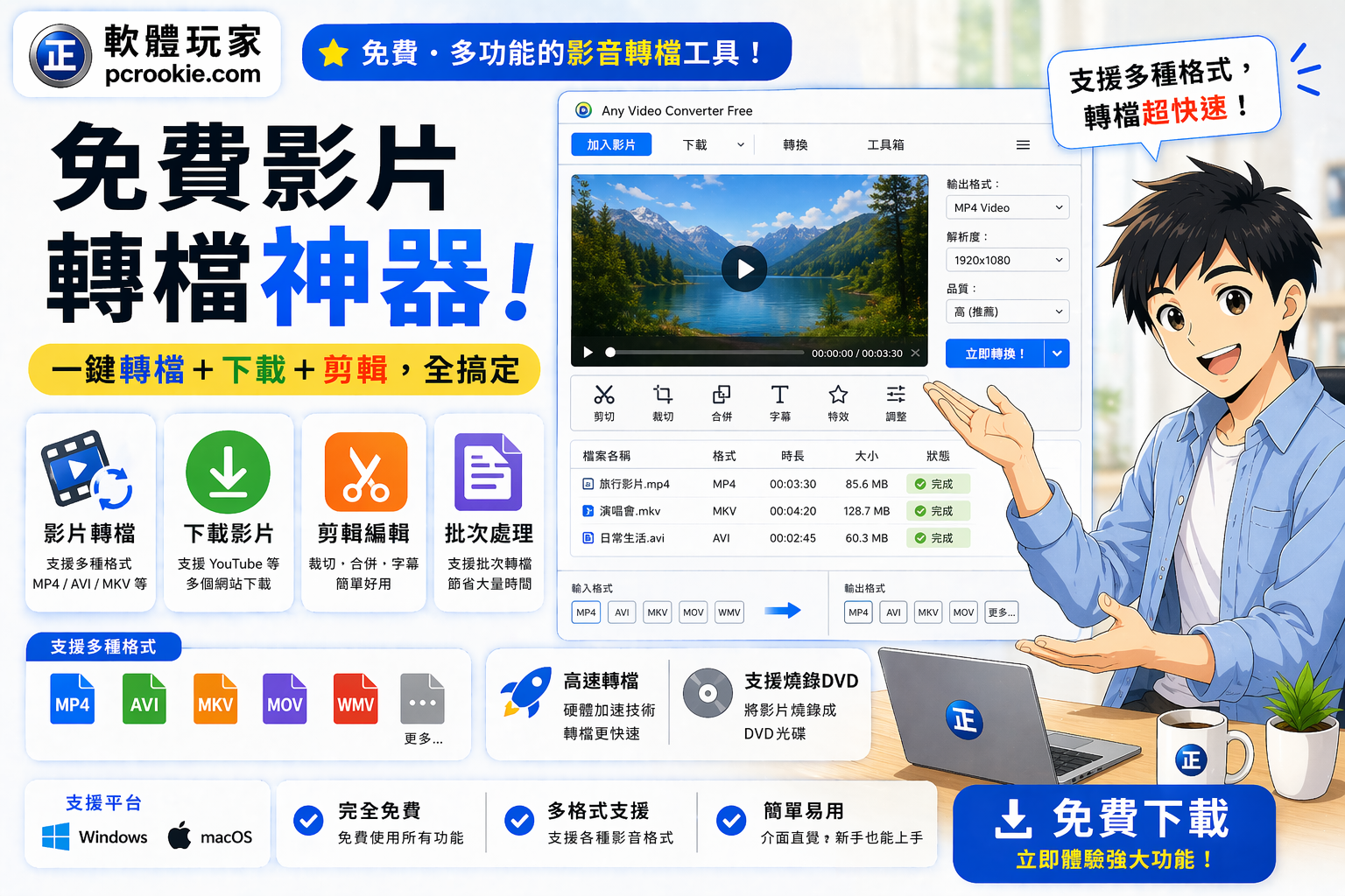如果你常常在網路上下載影片,或常常為了五花八門的影片格式轉檔而煩惱,又不想花錢買套轉檔軟體,那麼你絕對要試試看這個「Any Video Converter Free」!它沒有複雜的界面,只要簡單三個步驟就能幫你完成轉檔,而且還能幫你下載YouTube跟Google的影片,更支援了市面上主流的十多種影片格式,不論你是個轉檔的新手還是老鳥,它絕對是個不可錯過的選擇喔!